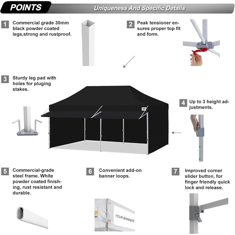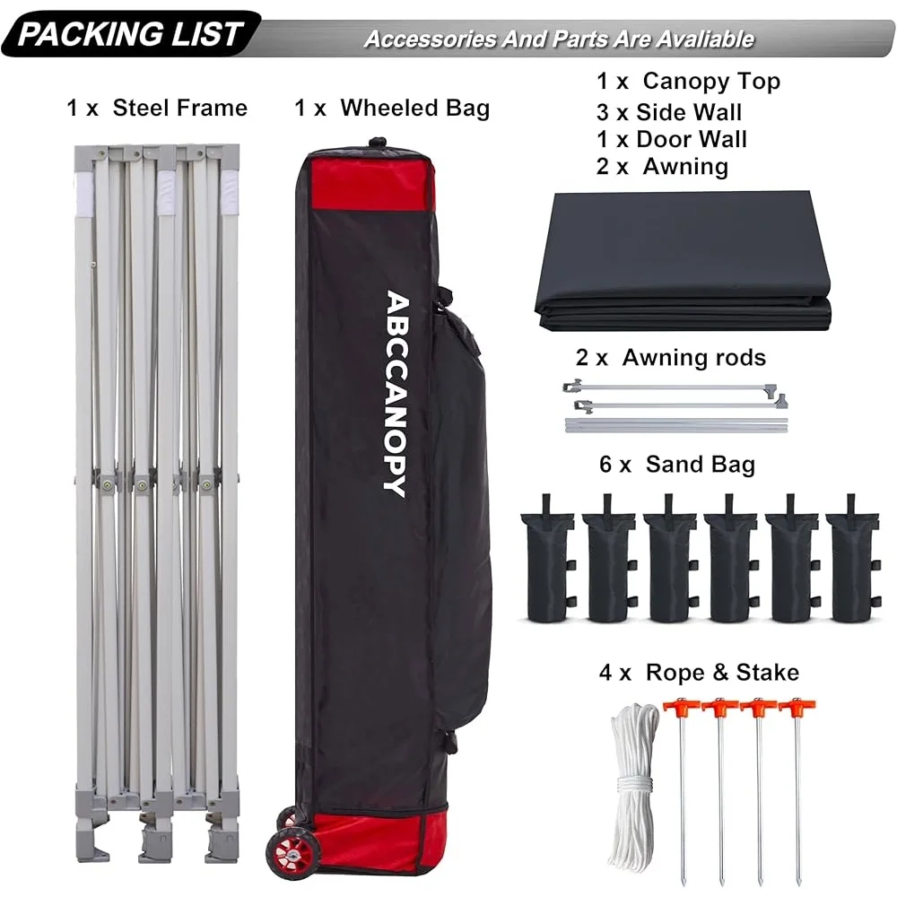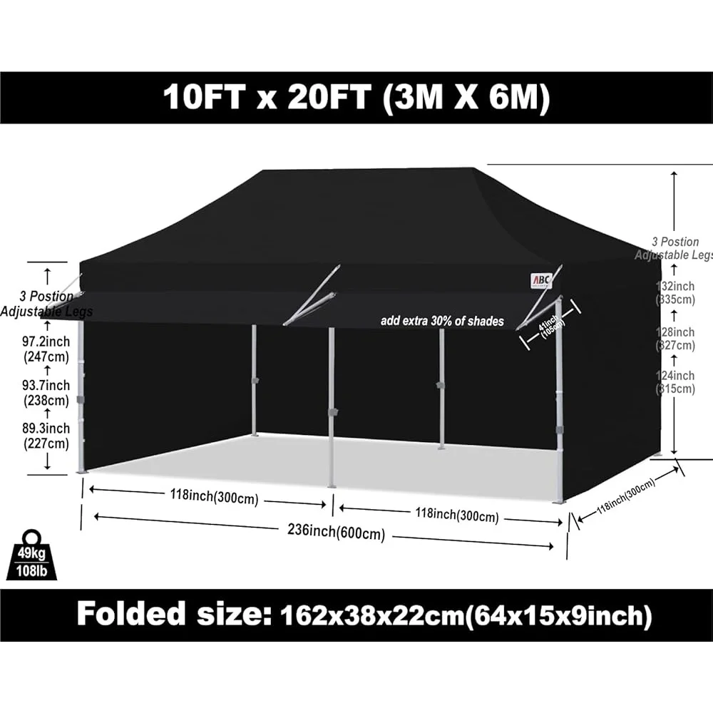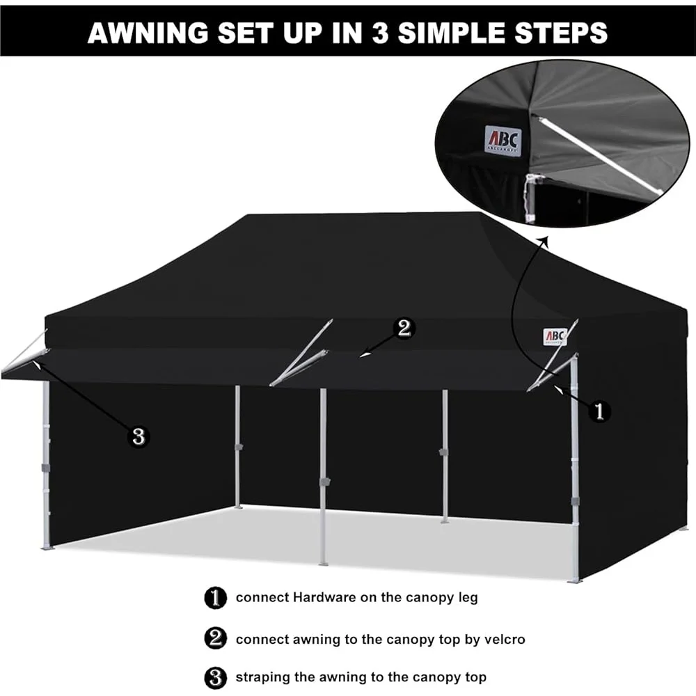 About this item 20% More Shade by the Awning: This 10×20 feet canopy tent with straight legs and 10’x20′ coverage at the top means you have more space with extra big awning: added about 23 square feet of ample cooling shade to your customers or friends. Provide hours of comforts and capture more attention from your customers. Easy to Set Up: one person can finish it in a few minute no tools required. Just take the fully assembled frame with top out of the bag, pull open, place the fabrics over the frame,extend the legs and you are done. Height settings at will – Three different height you could set. Peak Height Options: 136 inch,132 inch, 128 inch. Sturdy Rust Resistant Frame: Powder-Coated Steel frame with 100% nylon moldel brackets 1 1/4″ thick Square shaped legs, 20% stronger than Most Pop Up Canopy Tent in the market. Withstande 50 km/h of wind resistance combine 2 Formed rubber handles for lifting 1 formed rubber handle for rolling Reinforced. Waterproof Canopy Top and windproof Sidewalls: Canopy materials with 500 Denier Polyester for Canopy Top Cover, Heat Sealed Seams,Waterproof,and 210 Denier Polyester for side wall panels. Multiple velcro tabs with sticky hair to strap around frame legs. Large 2″ velcro and zipper to connect side wall to protect from wind. A Complete Set of Accessories: 1 x 10ft by 20ft pop up canopy top (waterproof), 6 x Sandbags, 4 x 10ft Sidewalls,2 x 10ft door wall, 2x 10ft upgrade awning with hardware. 1 x Roller Carry bag , 4 x Ropes ,4 x Stakes.