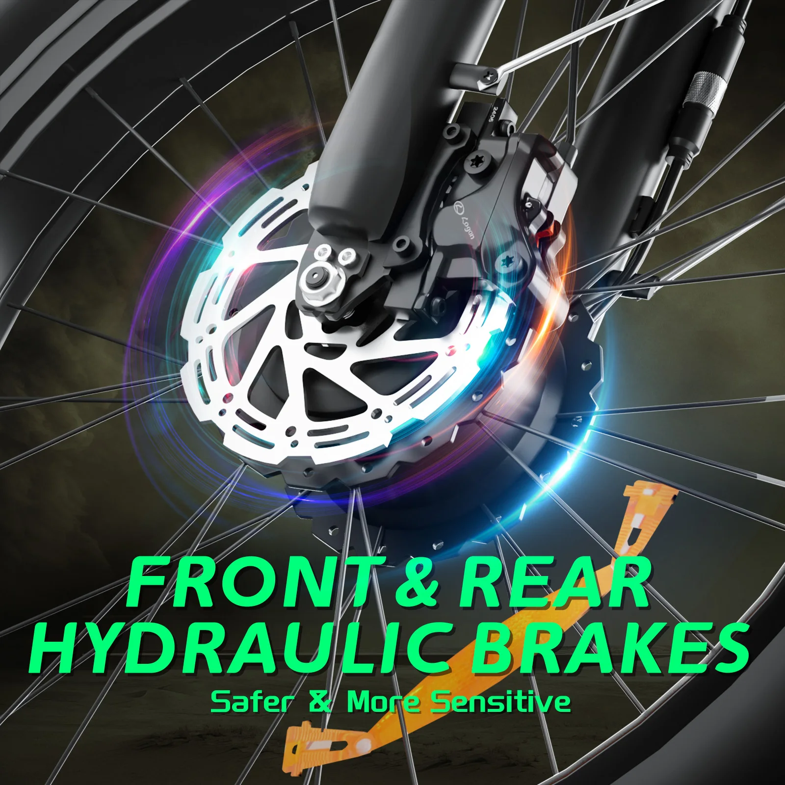 **26″ Fat Tires:** These tires offer exceptional traction, making the perfect for diverse surfaces, from sandy beaches to snowy landscapes.