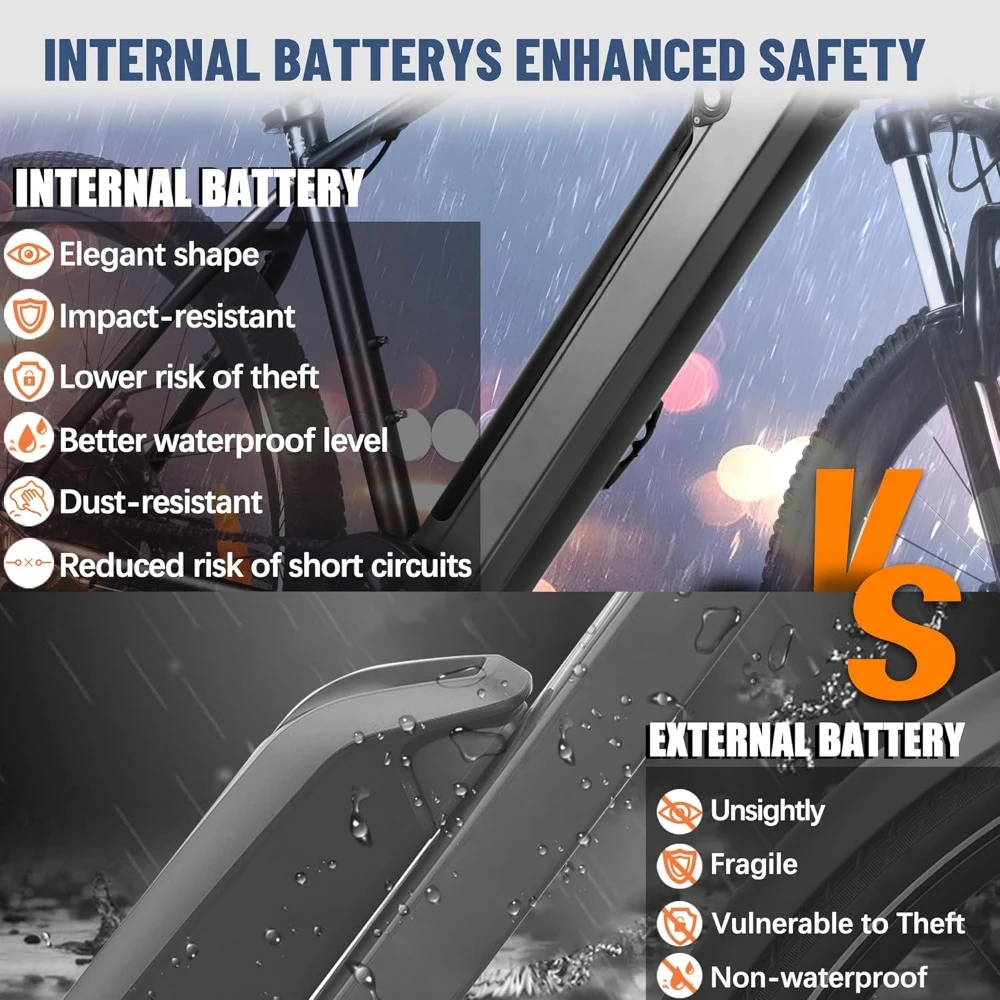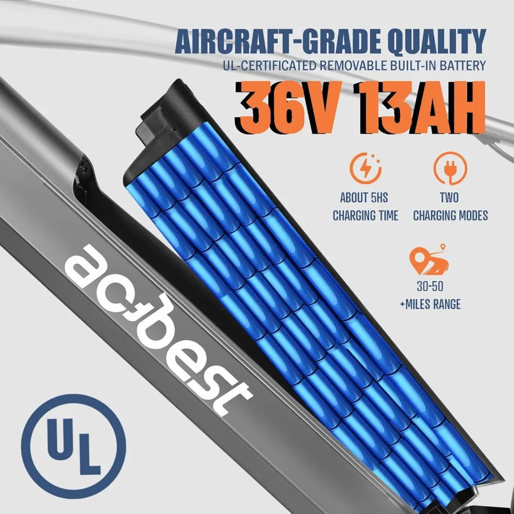 - 36V 13AH Removable Built-in Battery – The UL2849-certificated battery is easy to remove for charging and has a waterproof, shockproof and anti-theft design, which is safer and lasts much longer. The battery only takes 4-6 hours to fully charge, giving you a range of up to 35 miles (throttle)/50 miles (PAS) on a single charge.